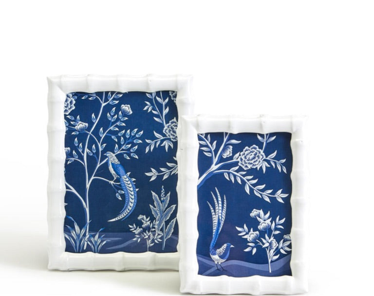 What a stunning set of frames. Made of a glossy Faux bamboo that will look so great in any home or beach house. Each frame comes with such beautifully hues of blue and white floral and fauna designed insert.